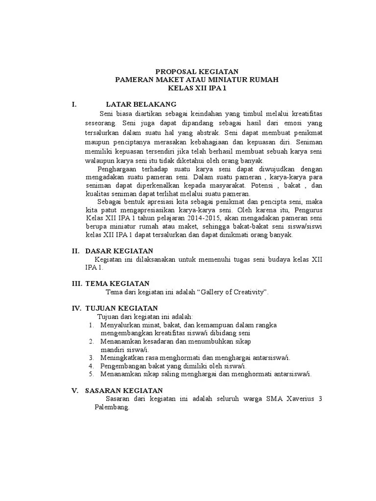 Cover (dapat dibuat sesuai cover proposal pada umumnya). Contoh proposal pameran seni lukis daftar isi i. Tersebut bisa direpresentasikan mengenai perkembangan yang terjadi dalam dunia seni rupa. Seni rupa adalah salah satu bidang seni yang melatih siswa untuk memperhalus rasa dan karsa. Berikut ini contoh proposal pameran seni rupa .